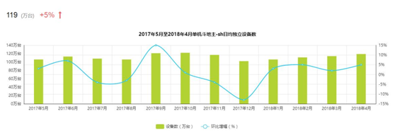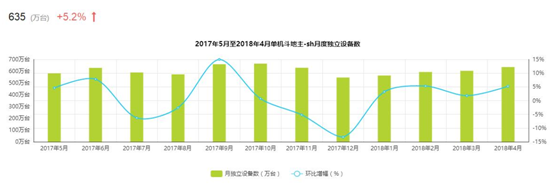 而在棋牌(pái)游戏总体(tǐ)表现不好的情况(kuàng)下(xià),《单机斗地主-sh》逆势(shì)而上,环比增(zēng)幅达5.2%,4月的日(rì)均(jun1)独立(lì)设备(bèi)数达119万台。根据它的月活和(hé)日活的数据变化来看(kàn),从(cóng)2017年底这款游戏就(jiù)可以说是已经触(chù)底反弹,表现抢眼。
