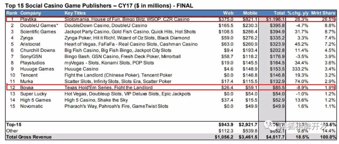 根(gēn)据调研(yán)机构(gòu) Eilers&Krejcik Gaming 不久(jiǔ)前发布的(de)《2017 Q4 社(shè)交**类(lèi)游戏追踪报告》,按公(gōng)司在全球市场份额来计,博雅互动排在第 12 位,是唯(wéi)二上榜(bǎng)的(de)两家中国(guó)公司之一,腾讯排在第 10 名(míng)。相较之下,中国市场在其(qí)它公司的(de)收(shōu)入占比(bǐ)要比这两家小得多(duō)。