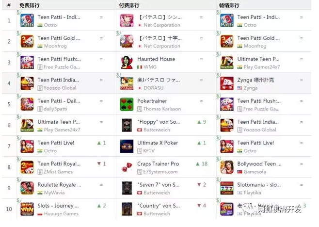 观察(chá)印度的榜单可以发现,印度人民(mín)喜爱**类游(yóu)戏且对(duì)炸金(jīn)花情有独钟。三款炸金花两年长期霸屏印度游戏畅销榜,至今热度不(bú)减。这种趋(qū)势在娱乐(lè)场游(yóu)戏细分榜(bǎng)单体现得(dé)更加淋(lín)漓(lí)尽致。下(xià)载 Top 10 里前 8 名全部是(shì)炸(zhà)金(jīn)花游(yóu)戏,在印(yìn)度下了(le)重注成立(lì)分公司的游族,旗下炸金花游(yóu)戏《Teen Patti India》排在第(dì) 4 位。畅销榜里也有7款炸金花游戏。除了炸金花(huā)之外(wài),目前在(zài)印(yìn)度市(shì)场比较多的(de)就是老虎机游(yóu)戏。Playtika、Huuuge Games 以及中国(guó)的(de)一些厂(chǎng)商都(dōu)开(kāi)始在印度推出老虎机游戏。