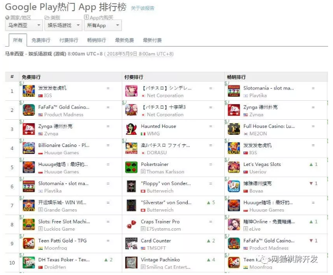 5 月 9 日(rì) Google Play 马来西亚娱(yú)乐(lè)场游(yóu)戏类 App 榜单|来源:App Annie