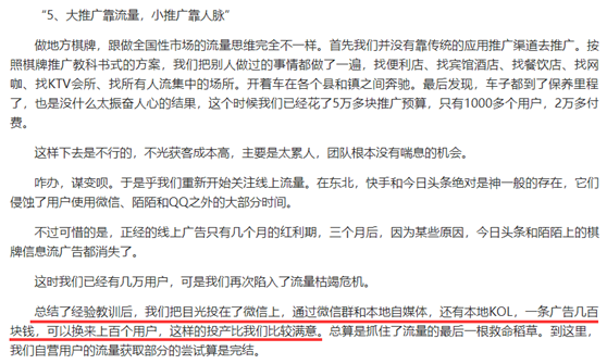 其实(shí)在地方棋牌兴起之初(chū),不少平台的推广人(rén)员就盯(dīng)上了(le)地方微信公众号等自媒(méi)体(tǐ),在文章(zhāng)内容合适的情况(kuàng)下,用户转(zhuǎn)化非常不错(cuò)。小编记(jì)得,去年年(nián)底的时候,一个地方(fāng)棋牌的(de)创业者写了(le)一(yī)篇这样的文(wén)章《本地棋牌游戏运营年终(zhōng)总结:风险与机遇(yù)并存》。在(zài)文(wén)章中作者(zhě)提到过,他们的推广团队一开始主打线下(xià),用(yòng)户增长和付费率并(bìng)不(bú)高。后来专(zhuān)攻(gōng)微信群(qún)和本地自媒体,一条广告几百块(kuài)钱,可以换来上百个用(yòng)户。