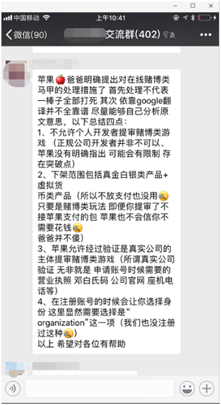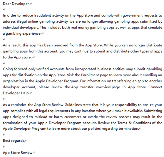 Store的欺诈行为,并遵守政府要求(qiú)解决非法在线赌博活动的要求,我们不再允许单个开发商提交赌博应用程序。这包括真(zhēn)实(shí)货币(bì)赌博应用程序以及(jí)模(mó)拟赌博体验的应(yīng)用程序。因此(cǐ),这(zhè)个应用(yòng)程序从App Store下架。当你不(bú)能再从这个账户(hù)分发游戏应用(yòng)程序时,你可以继续向App