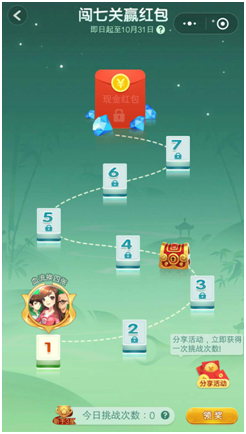 此(cǐ)外,游戏中新增的闯(chuǎng)关红(hóng)包模块,则是(shì)对游戏玩家吸引(yǐn)力(lì)最大的地方。闯关(guān)场共设七(qī)关,每名玩家每天有(yǒu)两次挑战机会,在(zài)每次(cì)对局中都能获得前两名,并一直赢到最后(hòu)第一名,才(cái)有(yǒu)机(jī)会(huì)获得不定(dìng)额现(xiàn)金红包。红包首次(cì)提现(xiàn)不设(shè)限制,此后单次提现需(xū)满5元。玩家(jiā)将活动分享出去,可额(é)外获得一次挑战机会(huì),从推广的角度(dù)来看,这也是非常有帮助(zhù)的。