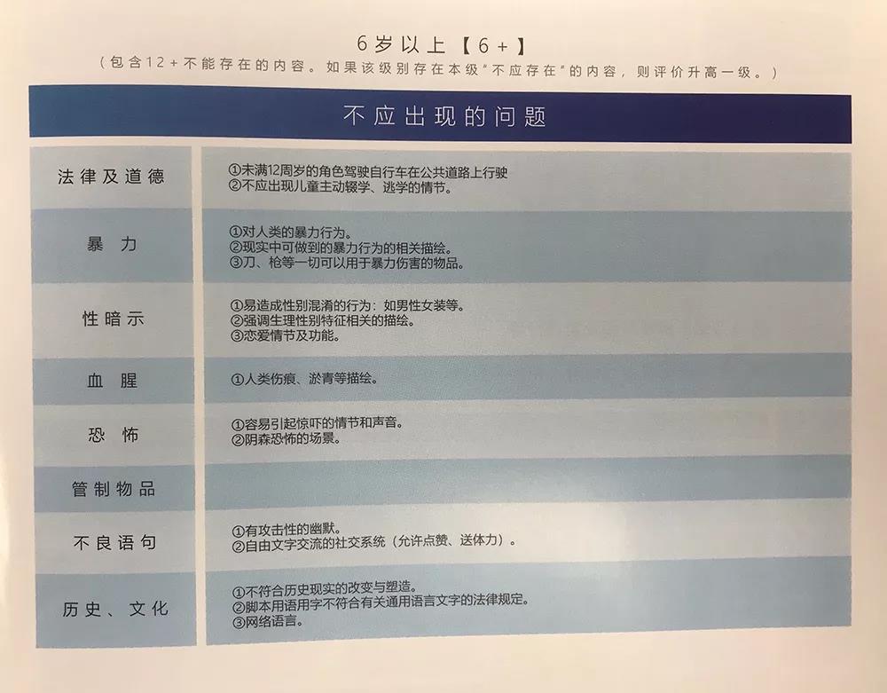 比(bǐ)如在18+一级里(lǐ),分法律与道(dào)德(dé)、暴力(lì)、性暗示、恐怖、管制(zhì)物(wù)品、不良语句、历史文化7个小项,如果某(mǒu)产品存在如“暴力”一项里的“鼓励/奖励恶(è)意PK”,就不符合标准。