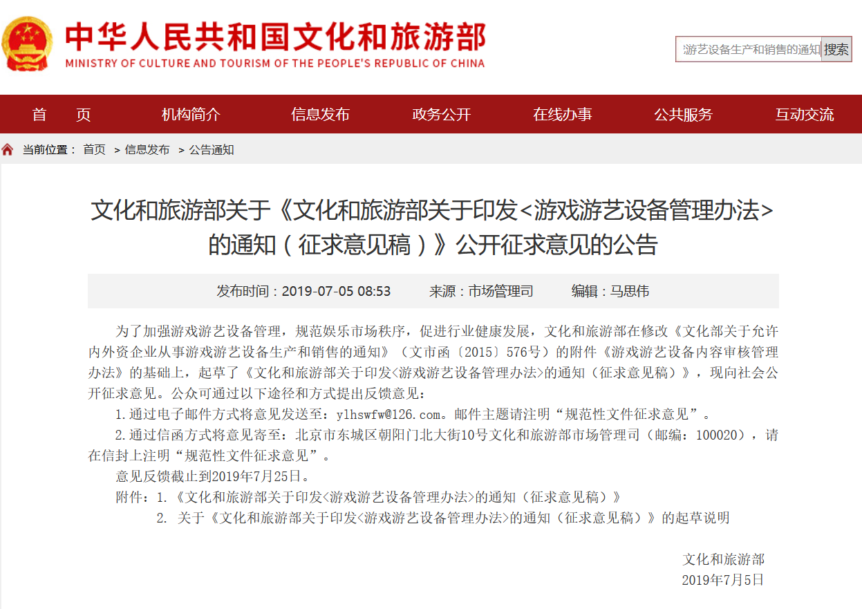 近(jìn)日,文化和旅游部发布了一则名为(wéi)《文(wén)化和(hé)旅游部关于印发<游戏游艺设备管理办法(fǎ)>的通知(zhī)(征求意见稿)》的(de)公告(gào),向社(shè)会公开征求意见。