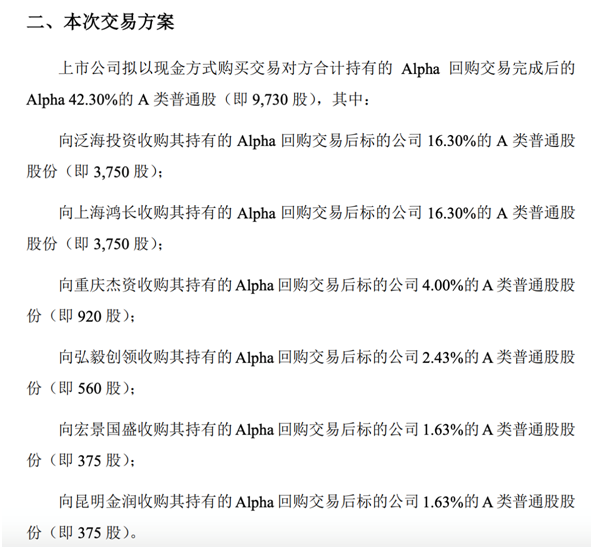 澎湃新闻记者(zhě)注意到,巨人网(wǎng)络将收购泛海投资持有的Aplpha16.3%的股权,收购上(shàng)海鸿长收购其(qí)持有(yǒu)的 Alpha 16.3%的股权,向(xiàng)重(chóng)庆杰资(zī)收购4%Alpha股权,向弘毅(yì)创领收(shōu)购Alpha2.43%股(gǔ)权,向宏景国(guó)盛收购Alpha1.63%股(gǔ)权,向昆明金润收(shōu)购Alpha1.63%股权,合计42.3%。除重庆杰资外,泛海投(tóu)资、上海鸿长 、弘毅(yì)创(chuàng)领 、宏景(jǐng)国盛 、昆(kūn)明金润皆出(chū)清了手中Alpha股权。