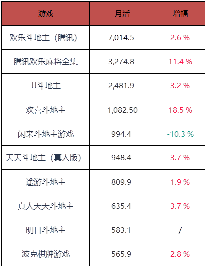 据易观千帆的数(shù)据(jù)统计,2020年2月TOP10的(de)棋(qí)牌产品中(不包括棋类游戏),共有9款呈上涨(zhǎng)趋势,且《腾(téng)讯欢乐麻将全(quán)集》、《欢喜斗地主》两款产品甚至都有两位数(shù)的增幅。其(qí)中《腾讯(xùn)欢(huān)乐(lè)麻将全(quán)集(jí)》月活(huó)达(dá)3274.8万,增(zēng)幅11.4%;《欢喜斗地主》月活达1082.5万,增(zēng)幅18.5%。
