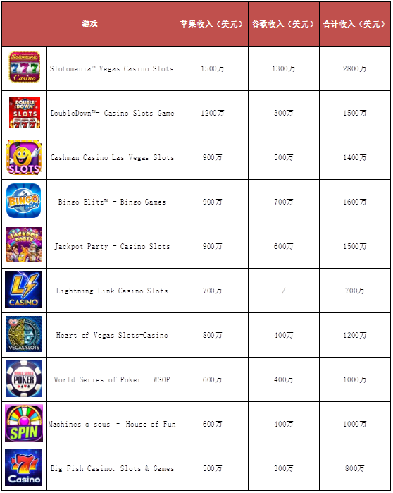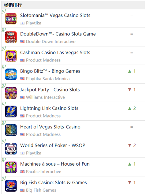 从数据上来(lái)看,这个市(shì)场绝对不小(xiǎo)。但是和(hé)全球最大的棋牌(pái)市场比,还是有差(chà)距。据风暴娱乐统计的数据,目前全球最大的棋牌市(shì)场在美(měi)国。我们可以(yǐ)从头(tóu)部产品的营收情况,来证实这一点。 考(kǎo)虑到美(měi)国(guó)苹(píng)果手机的覆盖率,我们选取了美(měi)国appstore娱乐(lè)场畅(chàng)销榜(bǎng)top10的产品(pǐn)来做调研。5月(yuè)22日,美国娱乐(lè)场(chǎng)游(yóu)戏畅销榜TOP10的名单如(rú)下: