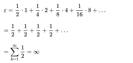 问(wèn)题是,你最多肯付多少钱参加(jiā)这个(gè)游戏?你最多肯付的钱应等(děng)于该(gāi)游戏(xì)的期望值: