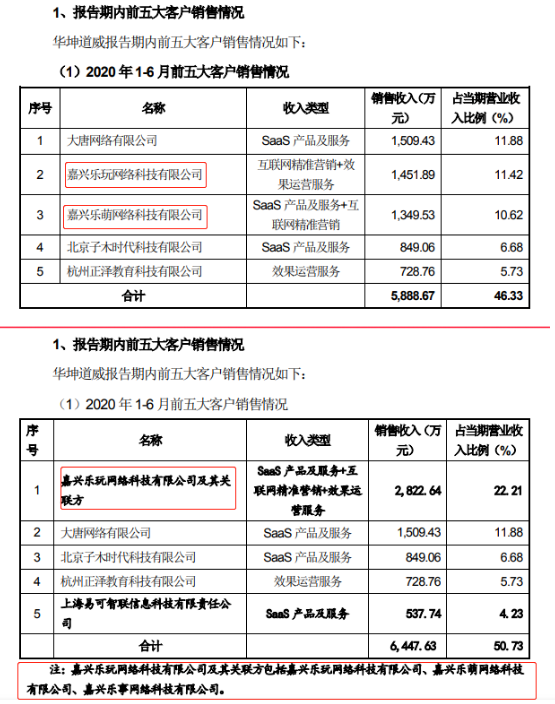 在修订的收购公(gōng)告中,财务顾问恒泰长(zhǎng)财表示“对报告期内(nèi)主要客户进行了访谈,再次确认所有业务合同和双方的结算单,并获取客户(hù)签署的访谈记录,访谈(tán)客户合(hé)计28家”。嘉兴乐(lè)玩(wán)、嘉兴(xìng)乐萌作为华坤道威今年上半(bàn)年大客户必然(rán)属(shǔ)于(yú)主要客(kè)户,若按(àn)照恒泰长财(cái)所说(shuō)其对(duì)主(zhǔ)要客(kè)户进行了访谈且客户还签署了访谈记录(lù),那(nà)么新通联(lián)为(wéi)何在第一次收购报告中没(méi)有披露嘉兴乐玩、嘉兴乐萌这两个主(zhǔ)要客户存在关联关系?又为何没有在大客户访(fǎng)谈期间做关联关系的(de)证实?