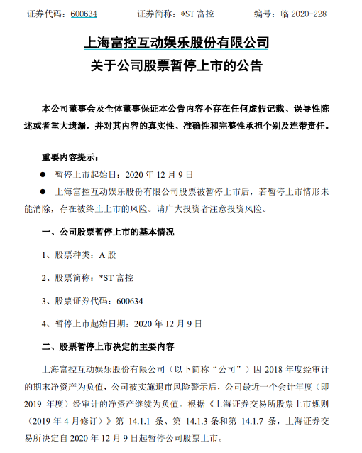 4日晚(wǎn)间,沪市第一低(dī)价股*ST富控发(fā)布公告,因2018年(nián)度经(jīng)审计的(de)期末净(jìng)资产为负值,公司被(bèi)实施(shī)退市风险(xiǎn)警示(shì)后,公司最近(jìn)一个会计年度(即2019年度)经(jīng)审(shěn)计的净资(zī)产继(jì)续为负值(zhí)。根(gēn)据《上海(hǎi)证券交易所股票上市规则,上海证券交易所决定自2020年(nián)12月9日(rì)起暂停公司(sī)股(gǔ)票上市(shì)。