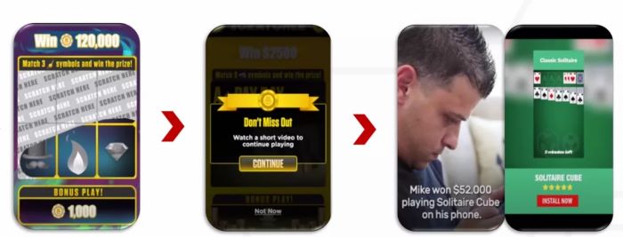 在游戏中(zhōng),玩(wán)家可通过刮奖券赢得筹码,再(zài)用筹码兑换真金(jīn)或礼品卡。但每天的刮(guā)奖次数有限,一(yī)旦玩家在一段时间(jiān)内达到上限,游(yóu)戏就会提示玩家通过观看激励视频来获得刮奖次数(shù),这也正(zhèng)好达到了(le)向(xiàng)玩家推送(sòng)广告(gào)以此形式(shì)盈利的目的。
