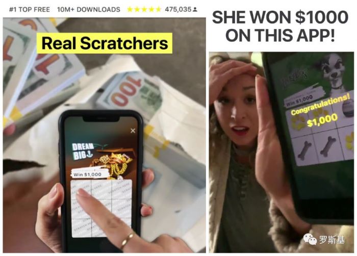 除了出手阔绰(chāo)的“撒钱”方式和优秀的游(yóu)戏(xì)质量(liàng),《Lucky Day》在买(mǎi)量上也毫不手(shǒu)软。广告素材(cái)更换频繁且投放的数(shù)量高,前三投放(fàng)渠道分别为Instagram,Facebook,以及Audience Metwork,投放素材以视(shì)频为主,广告中包含(hán)大量的真钞,以及得(dé)奖后(hòu)兴(xìng)奋的人,广告所带来的丰富奖励让(ràng)玩家的沉浸感得到了大幅提升。