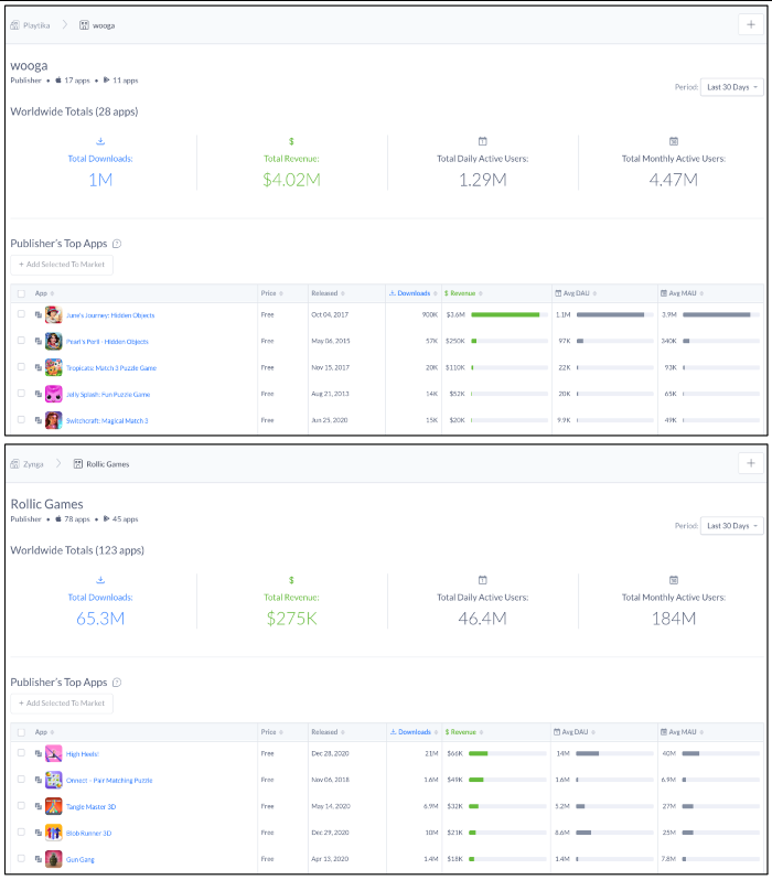 以(yǐ)Playtika、Zynga为例(lì),这两家(jiā)头部厂商采用了多元化竞(jìng)争策略,通过(guò)收购其(qí)他(tā)类型的手游公司,扩展业务范围,寻找更(gèng)多的增长动力。根据(jù)Apptopia中(zhōng)两家厂商的发行图(tú)谱来看,Playtika旗(qí)下的wooga和Zynga旗下的Rollic
