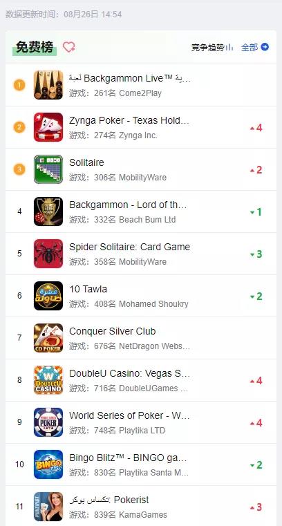 从这份榜单(dān)中(zhōng)可以看出,除去(qù)为(wéi)数不多的宾(bīn)果游戏(xì)。埃及的娱乐游戏已经逐渐被(bèi)棋牌类游戏所(suǒ)占据。虽然与印度这种(zhǒng)娱乐游戏榜单基本上都是(shì)棋牌游戏(xì)相比(bǐ)还有一定差距,但还(hái)是可以看(kàn)出,埃(āi)及棋牌游戏的(de)增长势(shì)头强劲(jìn)。