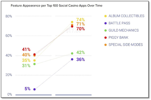 Battle Pass 可以增加单(dān)局游(yóu)戏之间的进度感,还(hái)可以为玩家带来成就(jiù)感。这种功能在(zài)社(shè)交(jiāo)棋(qí) 牌游(yóu)戏(xì)里的(de)普及率没(méi)有那么高(gāo),占据了 36%,但在这两年来出(chū)现了大(dà)幅增长。