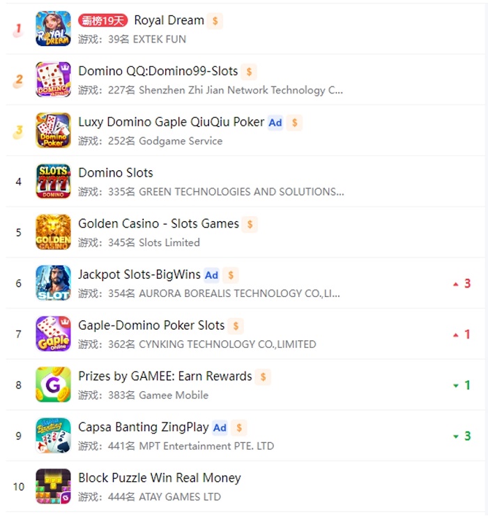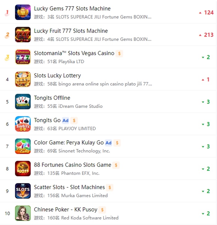 在菲律宾,slots 类游戏如 Lucky Gems 777 和(hé) Lucky Fruit 777 极受(shòu)欢迎,尤其是在即时奖励和刺激性方面。传统的 Tongits(菲律宾(bīn)纸牌游戏)也占据排行榜的一席之地,玩家对本土文化相关的游(yóu)戏有较强偏好。此外,带有社交(jiāo)元素的游戏,如 Tongits Go,也帮助(zhù)玩家增强(qiáng)互动体验。菲(fēi)律宾的游戏(xì)商业模式以广告和内购为主,进一步(bù)增强了盈(yíng)利能(néng)力。