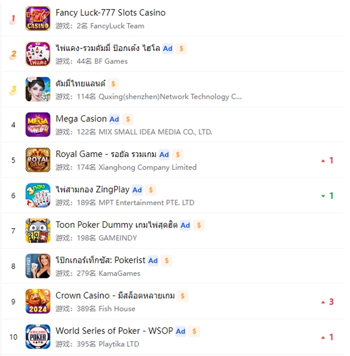 泰国市(shì)场(chǎng)的游(yóu)戏排(pái)名展示(shì)了传统(tǒng)纸牌类游戏和国际扑克、slots等广泛(fàn)受欢迎的玩(wán)法。尤其是Dummy 和Kaeng,这些本土化游戏(xì)深受泰国(guó)玩(wán)家喜(xǐ)爱。与此同时,多种综合游戏平台,如(rú) Royal Game 和(hé) Mega Casino,提供(gòng)了多种玩法,满足了玩家多(duō)样化需(xū)求。大部分游戏结(jié)合了广告收入和内购,反映出(chū)泰国玩家对广告插(chā)入的高接受(shòu)度(dù)。