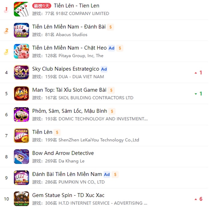 越南市场(chǎng)的棋牌游戏以 Ti?n Lên(越南扑克)为主导,并(bìng)且不同(tóng)版本的 Ti?n Lên 游戏几(jǐ)乎占据了排行榜的前半部分。除此之(zhī)外,slots 游戏和 Tài X?u(猜大小)也(yě)有广泛的市场。越南玩家对(duì)具有运气成分的休(xiū)闲游戏非常感兴趣,同时一些(xiē)结合解谜和策略(luè)元素的游戏也表现出市场多样化的趋势。类似(sì)广(guǎng)告和内购(gòu)的商(shāng)业模式在(zài)越南也被(bèi)广(guǎng)泛采用。