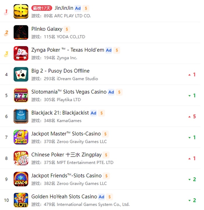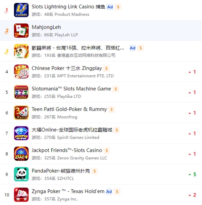 马来西亚玩家偏爱多人在线互动(dòng)游戏,如(rú) Zynga Poker 和 Blackjack 21。这些游戏提供(gòng)策略性和竞(jìng)技性,深受玩家青睐。与此同时,本地化游戏如 Big 2 - Pusoy Dos 和 Chinese Poker 十三水(shuǐ)也占据排行榜的重要位置,这反映出马(mǎ)来西(xī)亚(yà)玩家对本土文(wén)化游戏的(de)偏好。游戏(xì)通过多种盈利方式(广告和内(nèi)购)提高用户(hù)参与度,并且帮助(zhù)延长游戏生命周期。