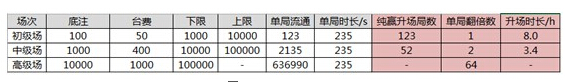 中级场作为(wéi)小r到中r的过(guò)度场次,要(yào)让玩家(jiā)体验到游戏的刺激,并且升高(gāo)级场几率要大一(yī)些。具体(tǐ)可(kě)通过底注台费来调整流通,如果通过(guò)这些(xiē)还(hái)不能满(mǎn)足要(yào)求,就要调整上下限。以满足我们(men)的预期(qī)。