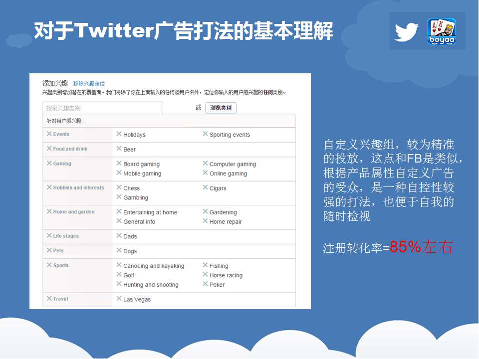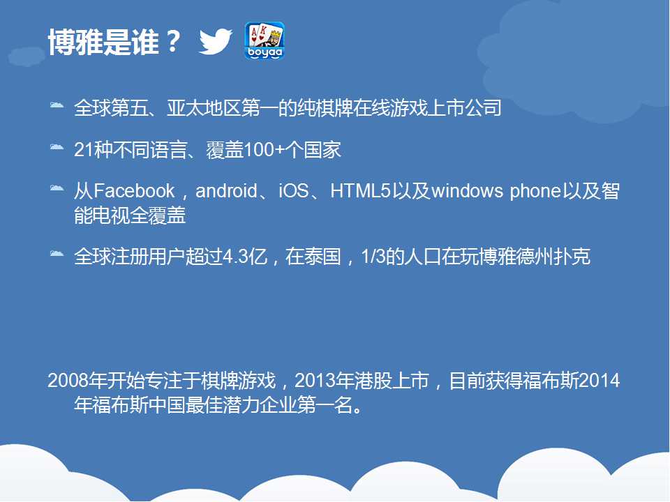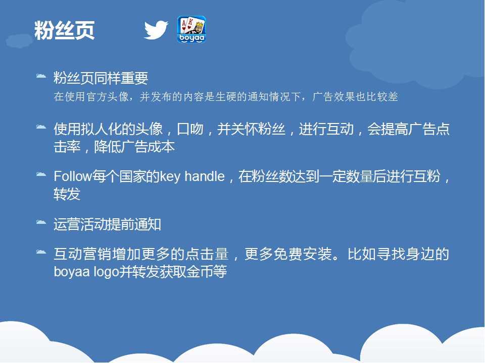 在(zài)这里(lǐ),风暴娱乐只想说,推广没有可以套用的模板。每个人手中(zhōng)掌握(wò)的资源不一样,产品(pǐn)的特征不一样(yàng),所能(néng)做到的事情(qíng)也就不一样。推(tuī)广方案(àn)肯定是要(yào)结合自(zì)身实际来量身(shēn)打(dǎ)造的(de),是要有数据累计的,同时也是有试错成本的。说到这里,我们(men)不(bú)妨来看看国内一线厂商博雅互动,是怎么在(zài)推特上做推广的。希望能给广(guǎng)大运营(yíng)商提(tí)供一些推广(guǎng)思路。