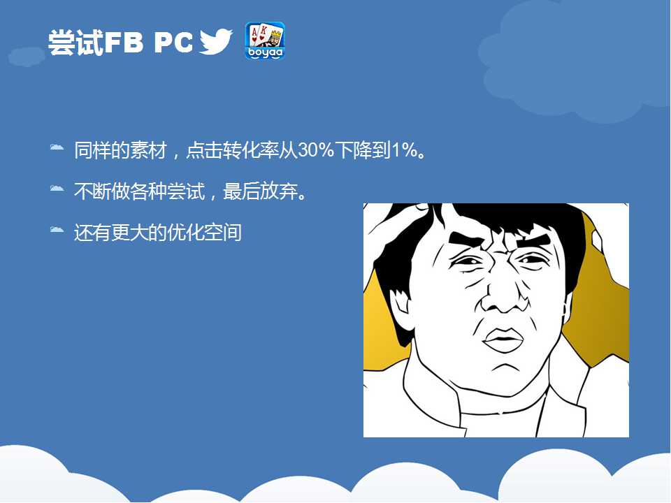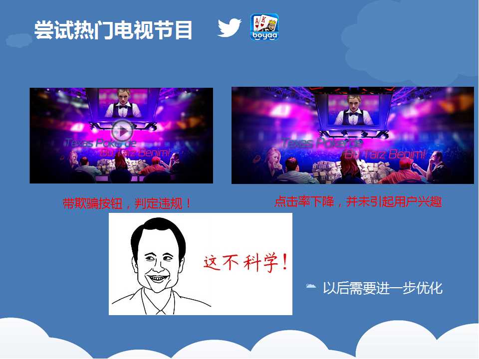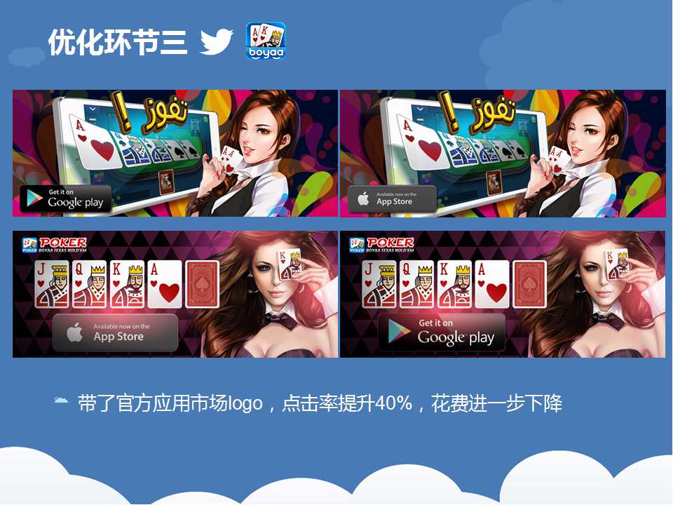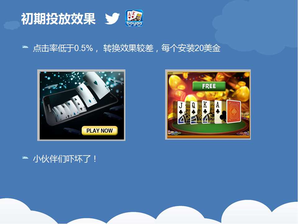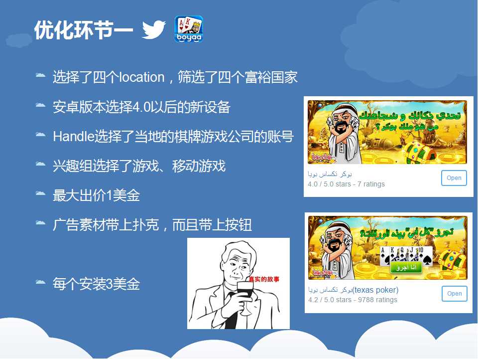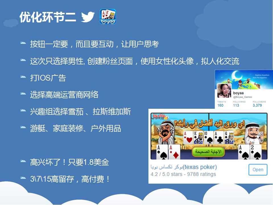 一路(lù)看下来,我们可以看(kàn)出,博(bó)雅(yǎ)推广的过(guò)程其(qí)实就是一个不断优化的过程,根据(jù)数据反(fǎn)馈及时(shí)调整推(tuī)广策略,从而一步步降低推(tuī)广成(chéng)本的。所以,在推广之(zhī)前,弄清楚自己(jǐ)手(shǒu)中的(de)筹码,以及(jí)如何将自己手中的筹码转化为(wéi)更多的(de)效益。风暴娱乐科(kē)技致力于棋(qí)牌游戏(xì)开发13年(nián),拥有(yǒu)大量开发(fā)运营(yíng)经验和大批成功(gōng)案例。