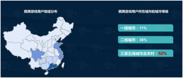 根据数据显示,棋牌游戏用户主要(yào)分布在沿海(hǎi)和四川等互联网人口大省,而在地方棋牌玩法丰富的南方内陆省份,也集中(zhōng)了大量的棋(qí)牌(pái)玩家,超过50%的棋(qí)牌用户分布在传统互联网渠道较难触及的中小城市及农村地区。不同类型的用户有不同的诉求,CP可以(yǐ)通过了解用户的特点和(hé)需(xū)求,明确(què)产品(pǐn)定位,有针对地(dì)对产(chǎn)品的玩(wán)法功能进(jìn)行调整(zhěng)。