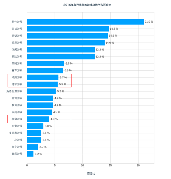 在报告(gào)中,棋牌游(yóu)戏被分(fèn)为(wéi):纸牌游(yóu)戏、博彩(cǎi)游戏、棋盘游戏(xì)三(sān)个(gè)维度区分。如果综合起来的话,棋牌游(yóu)戏(xì)的数量(liàng)占比应该是达到15.2%,只少于动作游戏。