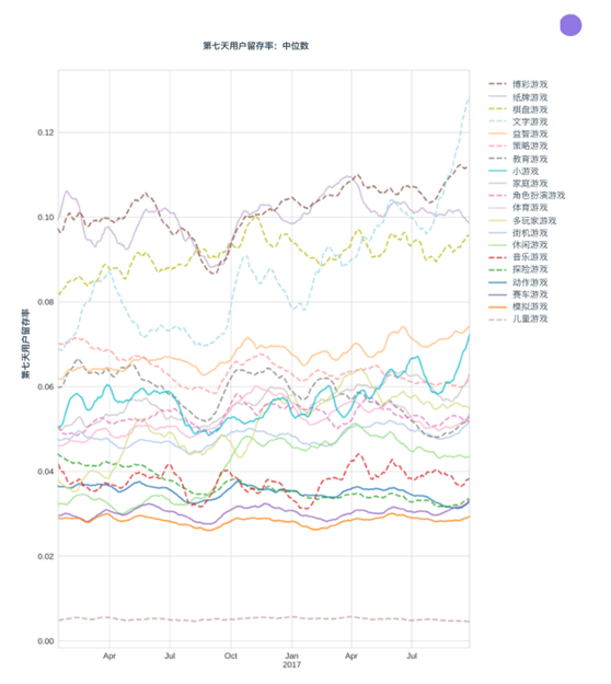 而从(cóng)平均第七天用户留存率来(lái)看,博彩游(yóu)戏(xì)、纸牌游戏、棋盘游戏包揽了所有(yǒu)游戏(xì)类型(xíng)的前三甲。报告显(xiǎn)示,一般来说绝大多数游戏的第七天用户(hù)留存率(lǜ)大约是4%,而从报告中(zhōng)我们可以看到,棋牌游(yóu)戏基本都高(gāo)于10%。
