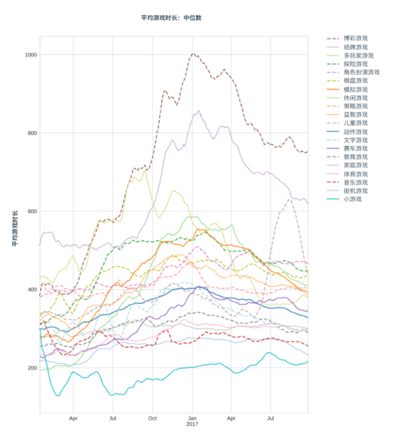 从数据上(shàng)我们也能看到,博(bó)彩游戏和(hé)纸牌游戏的平均游戏时长位于前(qián)两位,且(qiě)大幅领(lǐng)衔平均水(shuǐ)平。前16%的游戏的每次游戏时长平均11.5分钟,而垫底的16%的游戏每次游戏时长大约只有3分(fèn)钟。差不多是4倍的差距(jù)。