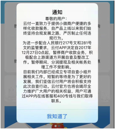 近日(rì),知名第三(sān)方支付(fù)公司云付对外发布公告称:为配合人民银(yín)行(háng)的监管要求以及上游渠(qú)道方的自查整(zhěng)改工(gōng)作,云付将(jiāng)于2017年12月27日0点起,将暂停商户收款功能,并且公司(sī)内部(bù)已经成立专(zhuān)项(xiàng)小组开展业务自查工作。