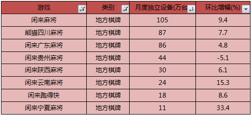 风暴娱乐在之前的(de)文(wén)章中曾介绍过,闲(xián)徕互娱(yú)旗下产品的数据在12月(yuè)迎来了(le)绝(jué)地反击,主要8款地方(fāng)棋(qí)牌产品有7款环(huán)比增长(zhǎng),其中《闲来宁夏麻将》的(de)增幅更是(shì)达到(dào)33.4%,只有(yǒu)一款(kuǎn)《闲来贵州麻将》的数据是下降的。