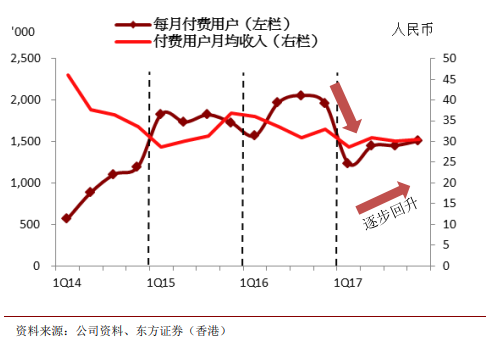 联(lián)众(zhòng)自营游戏(xì)的月活跃用户(hù)数量从 2016 年(nián)的 2,960 万大幅跌至(zhì) 2017 年第 1 季度的 1,970 万,原因有下:1)联众的部(bù)分(fèn)游戏玩(wán)家被(bèi)竞争同业的房(fáng)卡模 式吸引;2)移动(dòng)运(yùn)营商在此期(qī)间改变短信支付政策。尽管期内付费率及付