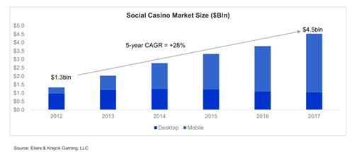 整个社交**类(lèi)游戏市场在过去5年增长迅速,从(cóng)2012年(nián)的13亿美元上涨到2017年的45亿美元,复合年增(zēng)长率达到28%。随着移(yí)动平台的崛起,社交**类游戏(xì)大爆发,受到了厂商的热捧,催生了一个又一个收购案。