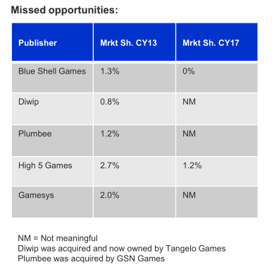 比如,Blue Shell Games 2013年占了1.3%的市场份额(é),去年在市场(chǎng)上(shàng)已(yǐ)经消失(shī)了。High 5 Games曾占2.7%的(de)市场(chǎng)份额,已经锐减了一半以上,只剩1.2%的市(shì)场份额。Diwip和Plumbee曾经也(yě)分别占了(le)0.8%和1.2%的(de)市(shì)场份(fèn)额,但各自被Tangelo