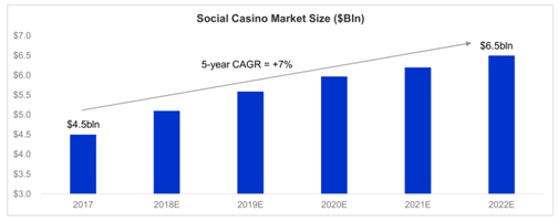 据Eilers & Krejcik Gaming的报告,未来5年,到2022年,社交**类游戏市场规(guī)模复合年(nián)增长率为7%,从(cóng)2017年的45亿美(měi)元增长到65亿美(měi)元,增长速度明显放缓。