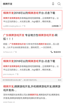 在该推广渠道搜索(suǒ)“棋牌开发”除了(le)风暴娱乐的广告外(wài)其(qí)他两家(jiā)都是运营商