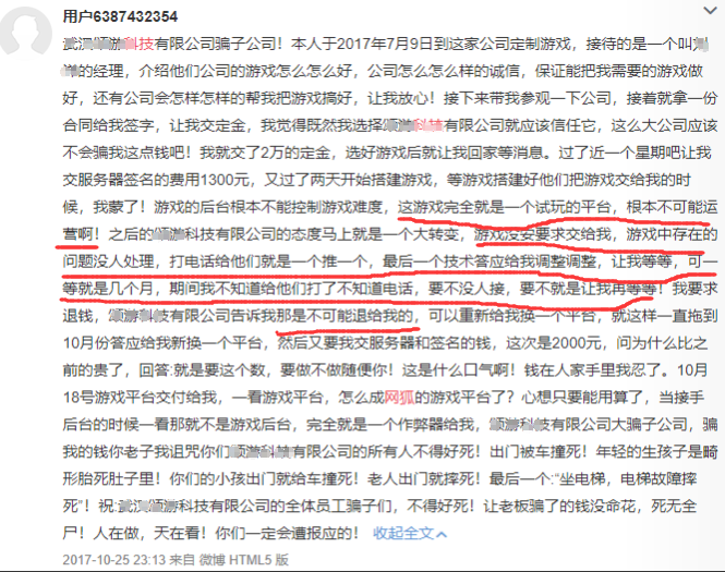这样的产(chǎn)品和服务质量(liàng)可想而(ér)知。一旦上线运营(yíng),各(gè)种(zhǒng)问题就都会暴露出来。这(zhè)些小(xiǎo)团队,本(běn)身没有平台开发(fā)能力,也没有解决问题的能力,引发纠纷也就不可(kě)避免了。甚至不少创业者(zhě)在(zài)花费数十(shí)万血本无(wú)归后,只能选(xuǎn)择(zé)在(zài)微(wēi)博上爆(bào)料。